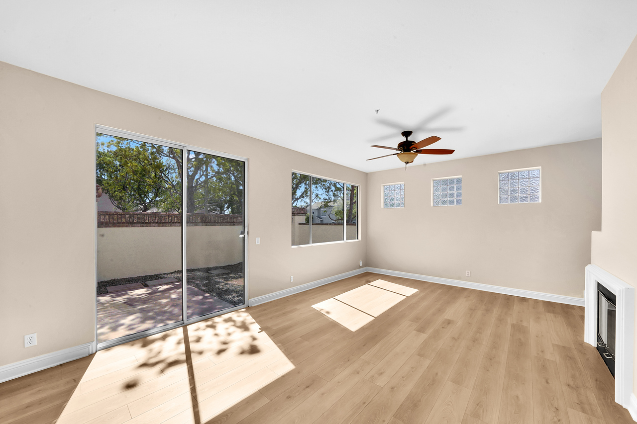 Elegant end-unit in gated Las Flores community featuring two generous bedrooms plus den (could be configured as 3rd bedroom), two and one-half baths, two-car attached garage, and private yard with custom hardscape. Designer upgrades include new laminate flooring, new carpet, elegant tile, freshly painted, multiple ceiling fans, custom blinds, and romantic fireplace. Fabulous floor plan with separate living and dining areas, popular media niche, sliding glass doors to backyard, and convenient inside laundry. Sparkling kitchen features handsome cabinetry, stainless steel appliances, dry-foods pantry, and under-cabinet task lighting. Primary suite features walk-in closet, and primary bath with dual sinks, soaking tub, and separate shower! Enjoy resort style amenities just steps away from pool and spa!